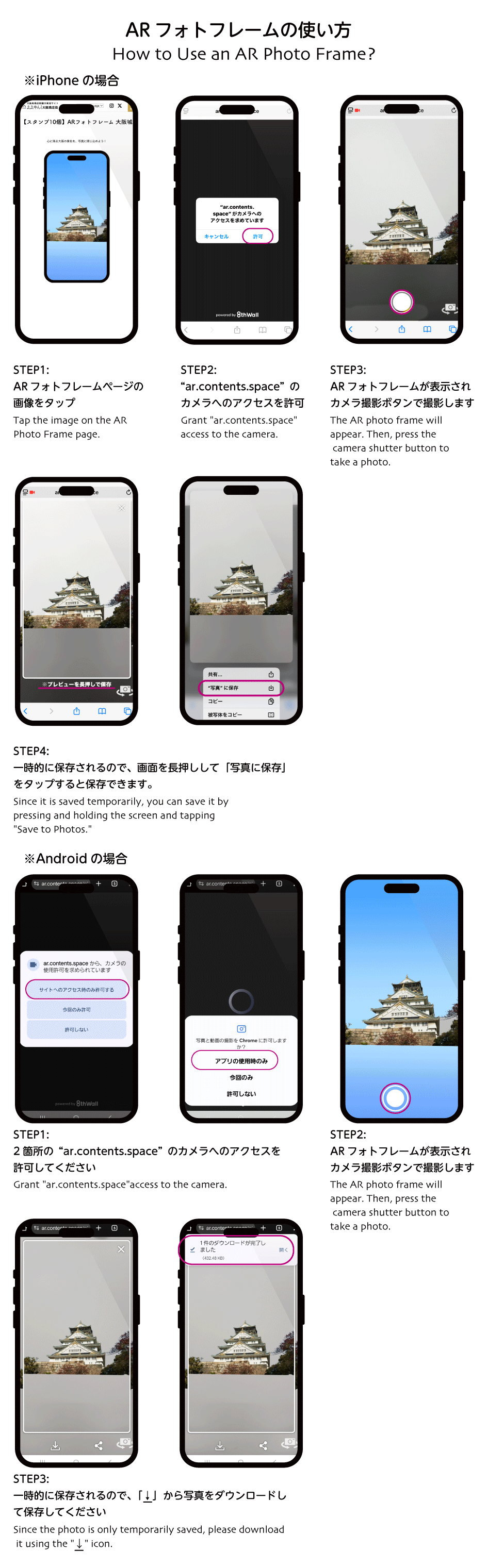 ※通信環境: 安定したインターネット接続(Wi-Fiまたは4G/5G)が必要です。通信が不安定な環境では、ARフォトフレームの読み込みが途切れることがあります。