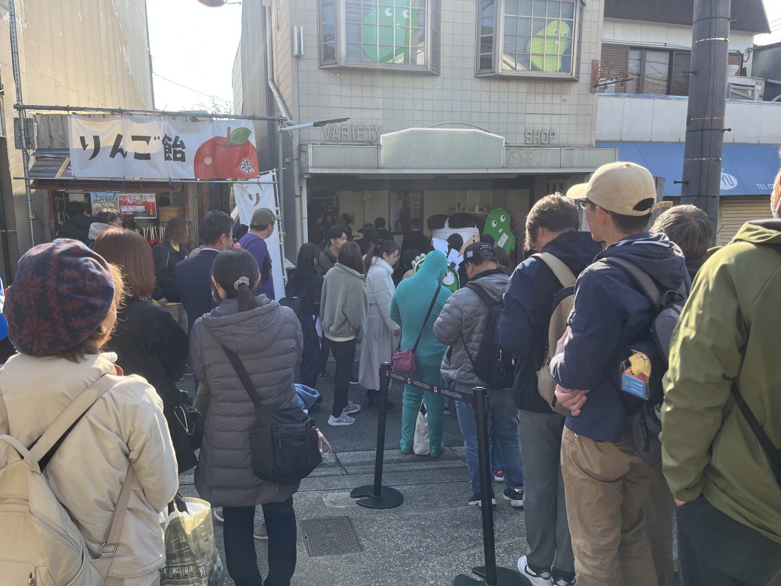 2025年12月7日のオープン当日には、商店街を巡るパレードやイベントを開催。通りには長い人の列ができ、パビリオンには入場制限がかかる場面も見られ、普段とは異なる雰囲気に包まれました。参拝客に加え、家族連れや若い世代、初めて石切を訪れた人の姿も多く、商店街全体に活気が感じられる一日となりました。