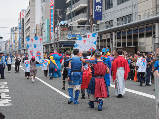 2025年2月のメインストリートには、大阪・関西万博を応援するのぼり旗が100本、ずらりと並びました。のぼり旗には、万博公式キャラクターのミャクミャク。赤と青のテーマカラーがはためき、通りは一気に華やぎました。