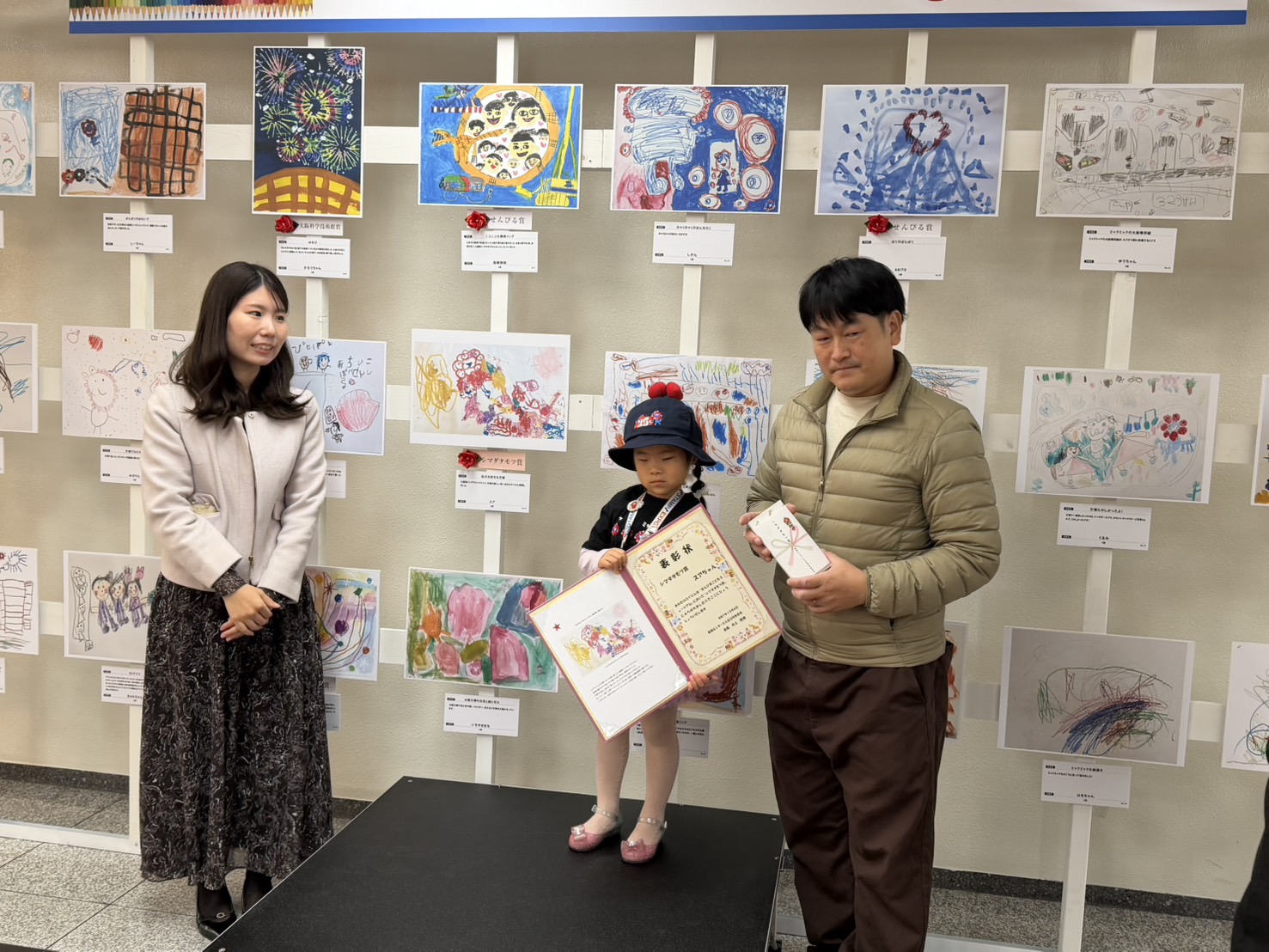 12 月初旬の表彰式では、船場センタービル内を巡るイベントも実施。館内の 3 箇所に展示された優秀作品を観るために、家族連れや初めてビルを訪れた人の姿も多く見られ、普段とは異なる活気に包まれました。地下鉄への出入口付近での展示が功を奏し、多くの来館者が立ち止まって作品を鑑賞。多くのメディアにも掲載され、地域全体での万博機運の醸成に貢献しました。