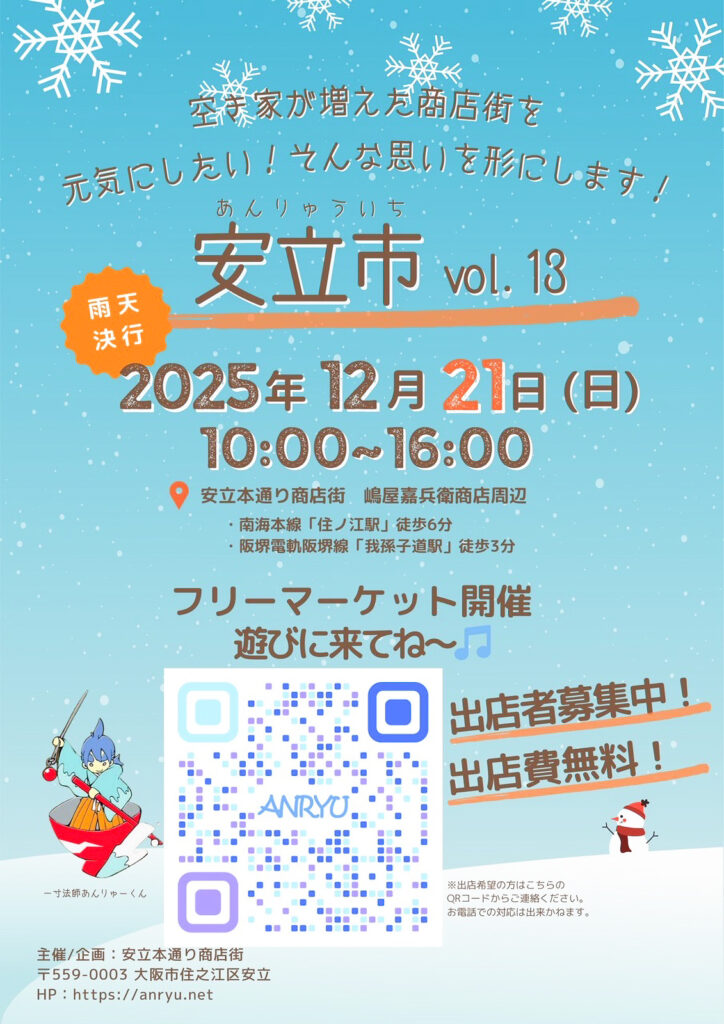 南海本線住ノ江駅とJR阪和線我孫子道駅の間、安立本通商店街の中にある嶋屋嘉兵衛商店周辺で、12月21日(日)に手作りの品や地域の逸品が集まる「安立市 vol.13」が開催されます。