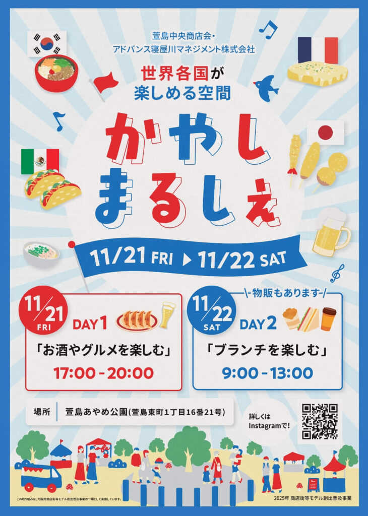11月21日(金)から22日(土)の2日間、京阪萱島駅からすぐ、懐かしい雰囲気に包まれた萱島中央商店会では世界の国々の食が楽しめるアフター万博な空間「かやしまるしぇ」が開催されます!