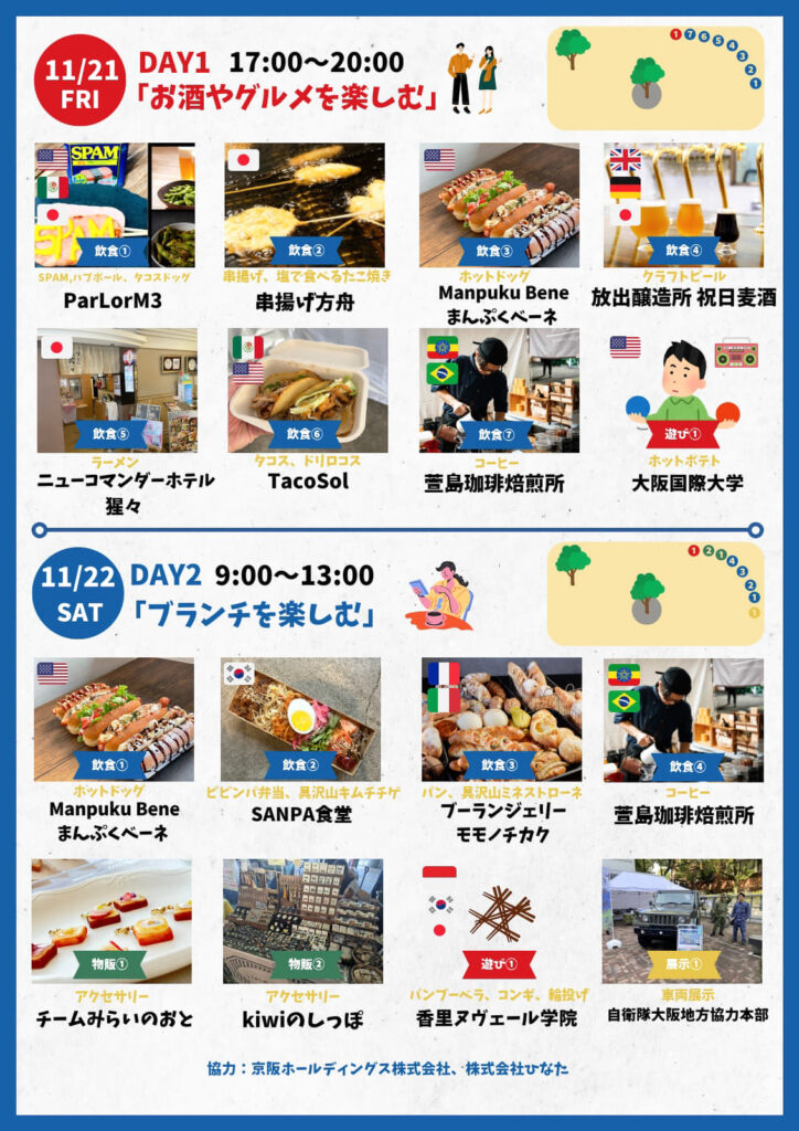 1日目は世界を旅するようなお酒やグルメが味わえるディナー、2日目はアクセサリー雑貨、ゲームのブース、旅気分の国際色豊かななブランチが楽しめます。爽やかな秋空の下、海の向こうの文化を味わいにぜひお越しください!