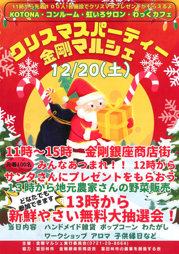 12月20日(土)に、南海高野線金剛駅の近くにある金剛銀座街商店街と周辺一帯で「クリスマスパーティー金剛マルシェ」が開催されます!
