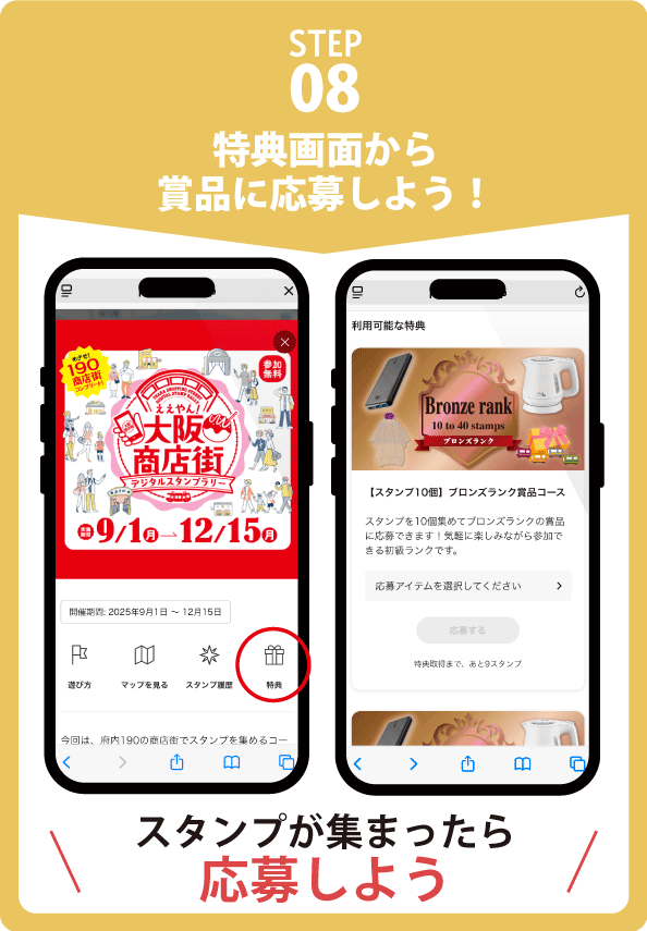 大阪府内190の商店街スポットをめぐって、素敵な商品をゲットしよう!最小10個から賞品に応募できます。獲得スタンプに応じて応募できる賞品グレードがアップ!みんなで一緒に商店街マスターにチャレンジ!