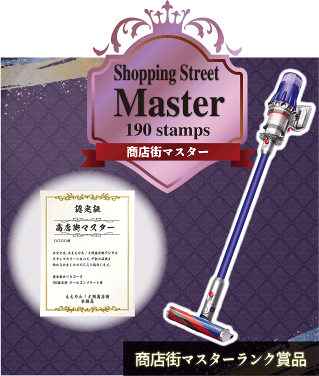 大阪府内190の商店街スポットをめぐって、素敵な商品をゲットしよう!最小10個から賞品に応募できます。獲得スタンプに応じて応募できる賞品グレードがアップ!みんなで一緒に商店街マスターにチャレンジ!